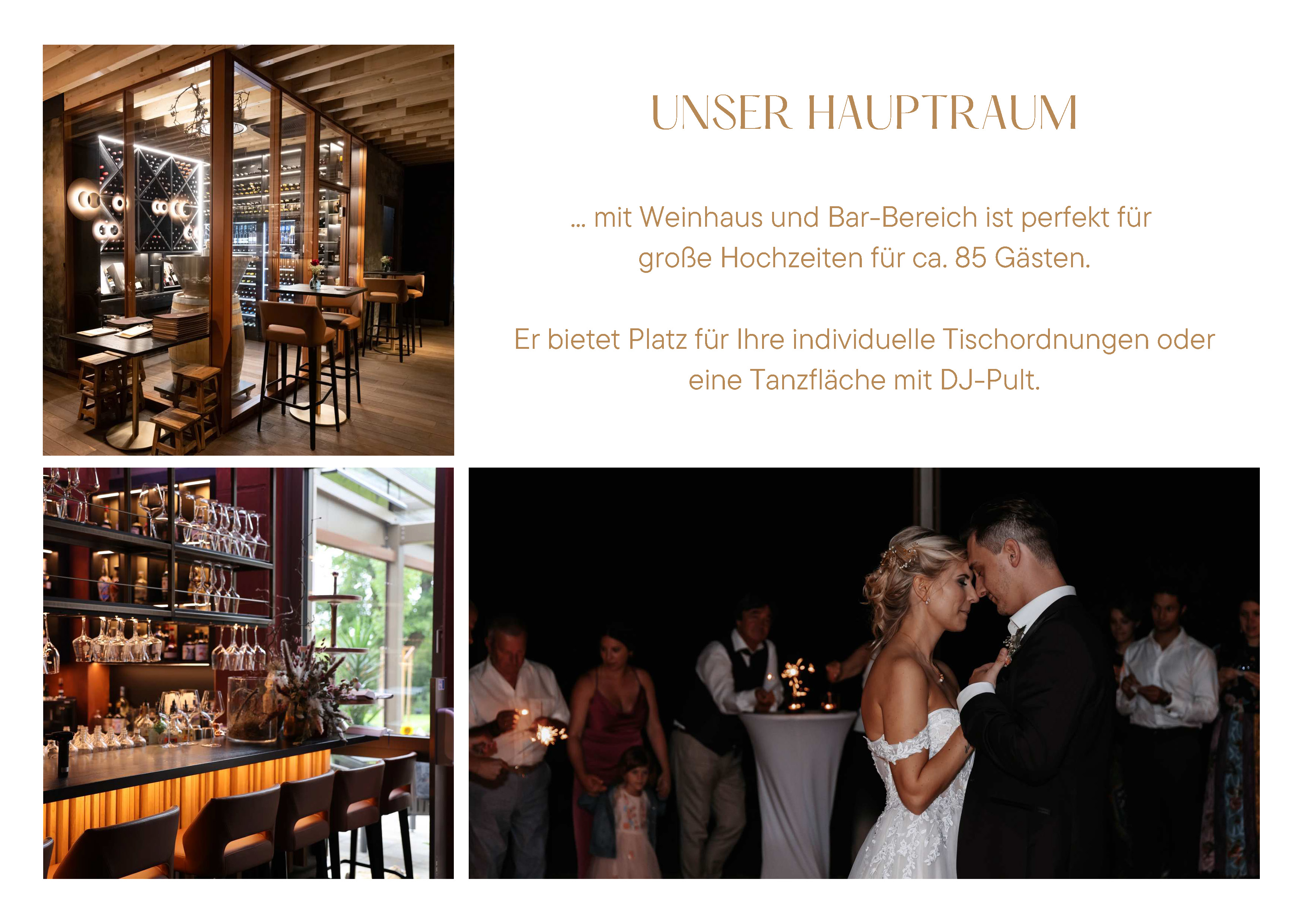 Im Ontra wird Ihre Hochzeit zu einem Erlebnis – mit stilvollem Weinhaus und Bar-Bereich, flexibler Tischordnung und einer Tanzfläche mit DJ-Pult, die jede Feier in ein unvergessliches Fest verwandelt.