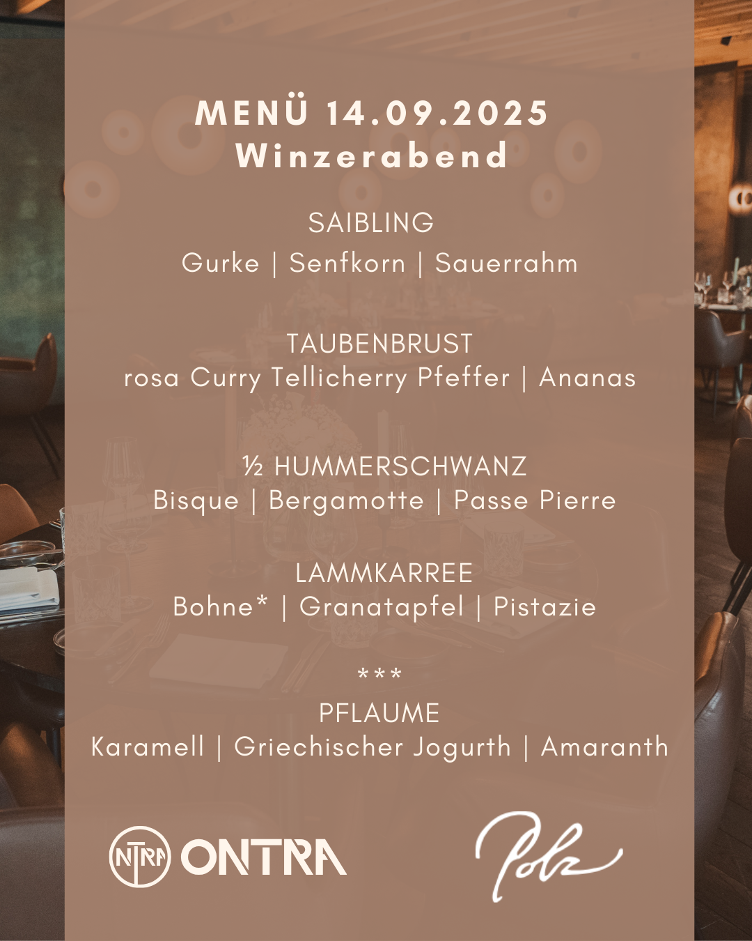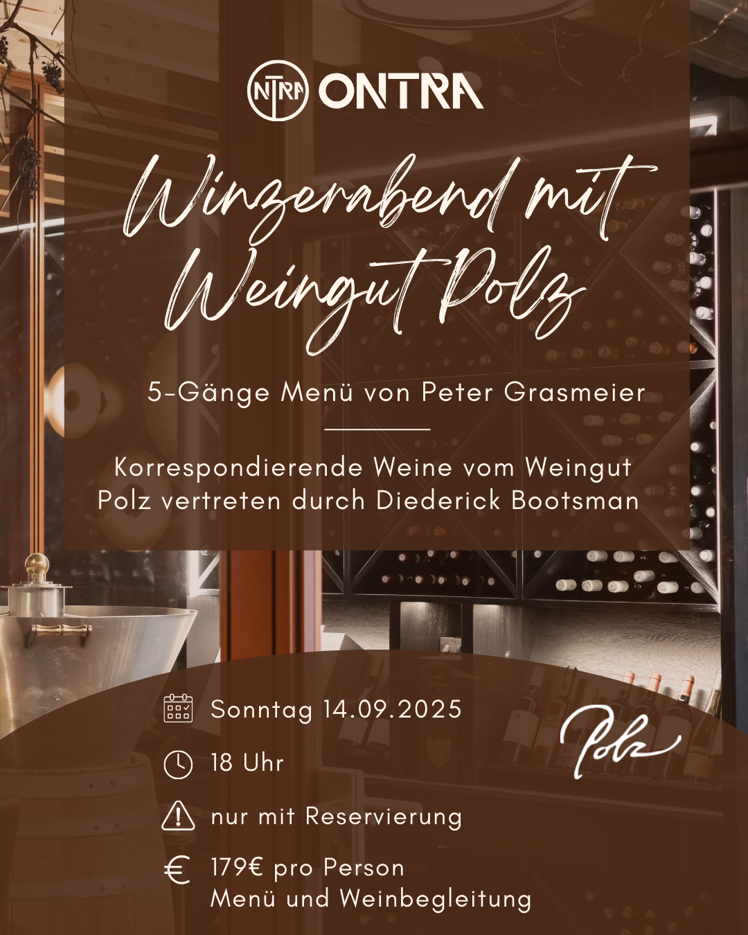 Lass den Sonntag in gemütlicher Atmosphäre ausklingen und genieße einen besonderen Abend mit einer exklusiven Weinverkostung. Erleben Sie das unvergleichliche Gefühl eines 5 Gänge Menü von Peter Grasmeier passend dazu eine Weinreise von Weingut Polz welches vertreten wird durch Diederick Bootsman.